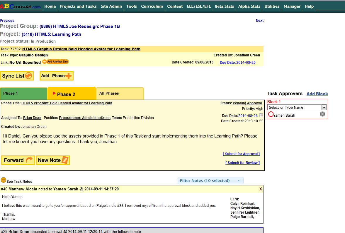 The task system went through many iterations, but had the functionality to keep track of task notes, require multiple approval steps, and have multiple task phases.
